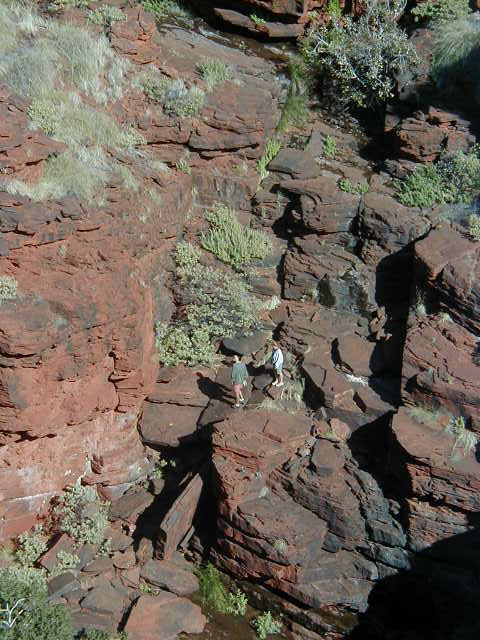 The Adventure Park, Karijini National Park .... After a night at Auski Roadhouse put to sleep by the drone of the diesel generator it was time to move on to Karijini National Park. A 70 km drive on first class bitumen roads to the park entrance and then another 10 km on a dirt road to the Fortescue camping area which was to be our base for the next four days. Whilst very basic; no power, no grass, no showers and lot's of red dust it did have nice clean pit toilets. We have found, without doubt, that the Hammersley red dust is the dustiest, dirtiest red dust in all Australia, basically because it is made up of iron oxide (rust).