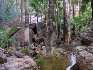 cool water surrounded by palms, bracken ferns and rock fig trees hugging the