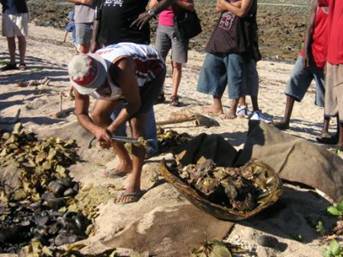 in coals for hours (picture right), a dugong was also cooking and rock oysters